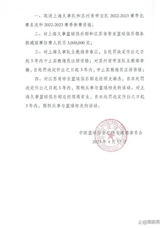 中國籃協(xié)17日公布對上海久事隊(duì)蘇州肯帝亞隊(duì)的處罰決定,認(rèn)定兩隊(duì)消極比賽情況屬實(shí),取消兩隊(duì)2022-2023賽季比賽名次和參賽資格,對兩隊(duì)各核減聯(lián)賽經(jīng)費(fèi)人民幣500萬元。上海久事隊(duì)主教練李春江被中止教練資格5年,蘇州肯帝亞隊(duì)主教練李楠被中止教練資格3年。