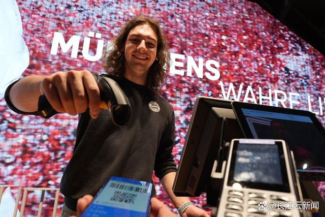 歐錦賽揭幕戰(zhàn)安聯(lián)球場的特許紀念品商店中,球迷正使用支付寶購買紀念品