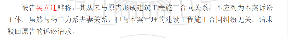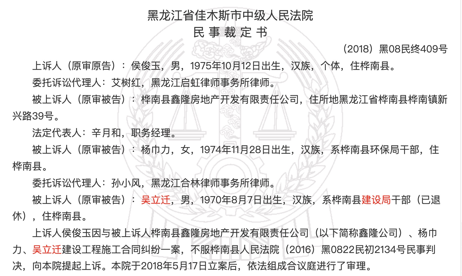 吳立遷為1970年生人,因卷入建設(shè)工程施工合同糾紛,多次出現(xiàn)在裁判文書中。2018年8月7日的一份文書顯示,吳立遷為樺南縣建筑局退休干部,同為被告的楊巾力為樺南縣環(huán)保局干部。同年12月的一份文書顯示,楊巾力是吳立遷的妻子,比他小4歲。