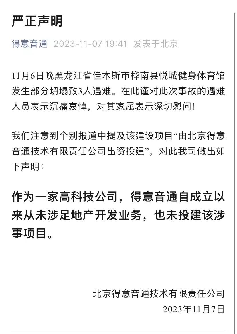蹊蹺的是,被樺南縣政府稱為項目投資方的北京得意音通技術(shù)有限公司在11月7日晚發(fā)布聲明稱,“作為一家高科技公司,得意音通自成立以來從未涉足地產(chǎn)開發(fā)業(yè)務(wù),也未投建該涉事項目?!?/p>